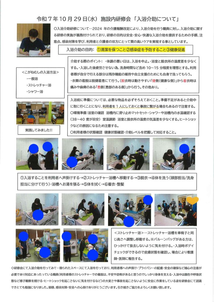 株式会社こがねむしでは毎月施設内研修会を行っております。10月は「入浴介助について」をテーマに、実技を交えながら研修を行いました。2024年度の介護報酬改定により、入浴介助を行う職員に対し、入浴介助に関する研修の実施が義務付けられております。この研修により安全・安心・快適な入浴介助を提供するための手順や注意点、感染対策を学び、利用者様と介護者の双方にとって質の高いケアを実践できる様、今一度業務の流れを再確認いたしました。入浴介助は常に事故と隣り合わせであることを意識しながら、今後も安全な入浴介助を心掛けてまいります。