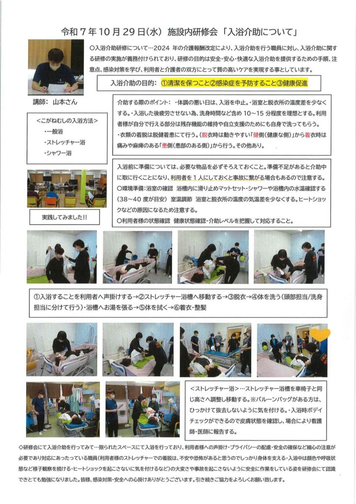株式会社こがねむしでは毎月施設内研修会を行っております。10月は「入浴介助について」をテーマに、実技を交えながら研修を行いました。2024年度の介護報酬改定により、入浴介助を行う職員に対し、入浴介助に関する研修の実施が義務付けられております。この研修により安全・安心・快適な入浴介助を提供するための手順や注意点、感染対策を学び、利用者様と介護者の双方にとって質の高いケアを実践できる様、今一度業務の流れを再確認いたしました。入浴介助は常に事故と隣り合わせであることを意識しながら、今後も安全な入浴介助を心掛けてまいります。